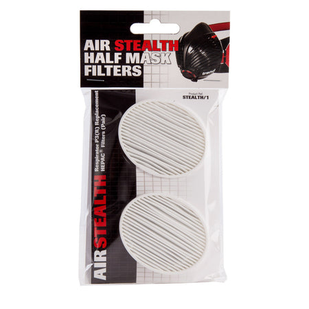 Pair of P3(R) filters for AIR STEALTH half mask with Twin HEPAC pleat encapsulated design filter providing 99.99% filtration of airborne particles and aerosols at 0.3 micron and above. Fit both sizes of mask STEALTH/SM and STEALTH/ML.