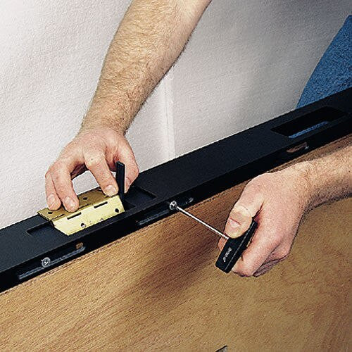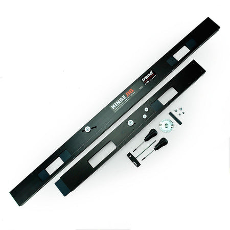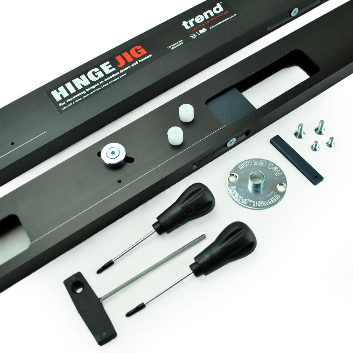 Trend H/JIG/A 2-Piece Hinge Jig complete with apertures, bradawls with spacer, 16mm guide bush, T-Handle hex key, 4mm spacing gauge and fabric storage case