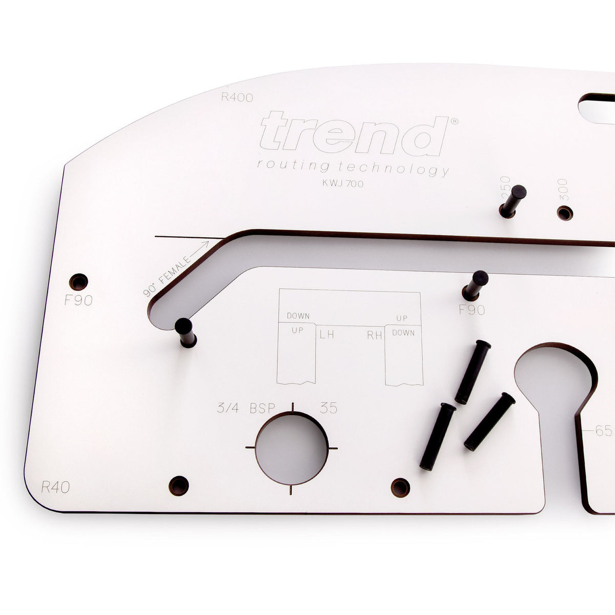 The Trend KWJ700 Kitchen Worktop Jig is a hard-wearing solid laminate, 12mm thick jig that cuts both parts of the joint in 15 minutes including setting up. Trade all in one jig for joining worktops up to 700mm wide with a router.