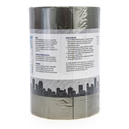 The Tuffite T0400003 is a roll of Self Adhesive Flashing Tape measuring 10 metres in length with a width of 225mm. It has been designed to provide a waterproof seal between two surfaces and will bond securely to brickwork, slate, window frames, glass and even metal downpipes. Prepare surfaces by removing loose matter dust and moisture. It is easy to install, just cut a strip to size and remove the protective film. Press on and smooth down with a cloth or roller removing any air bubbles. Do not apply in temperatures below 5 degrees centigrade.