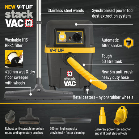 V-TUF STACKVAC Syncro M-Class Wet & Dry Dust Extractor 30L – Health & Safety Version (110V)