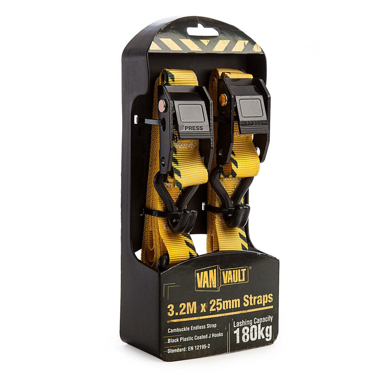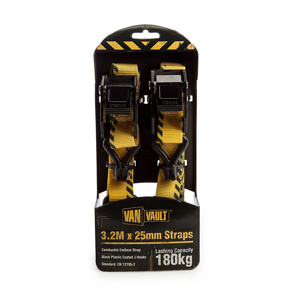 The Van Vault S10672 Ratchet Straps are a pair measuring 3.2 Metres long with black plastic coated J Hooks. The 25mm wide Straps are made from durable yet flexible polyester webbing to secure loads in transit - suitable for use on industrial, commercial and domestic vehicles.