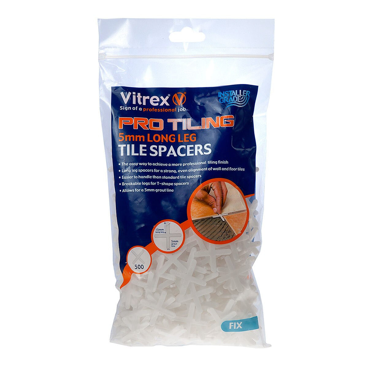 Long Leg Spacers from Vitrex are the easy way to achieve a professional tiling finish. By ensuring an even spacing of tiles, allowing for the specified size in grout line, the finish will look like you've hired a Tiler. The tile spacers have easily breakable legs for T-shape spacers, handy for the top edge and bottom edge. They are easier to handle than standard tile spacers and allow for a 5mm grout line. Supplied in a re-sealable bag, which stops the remainder scattering, for storing until the next tiling job.