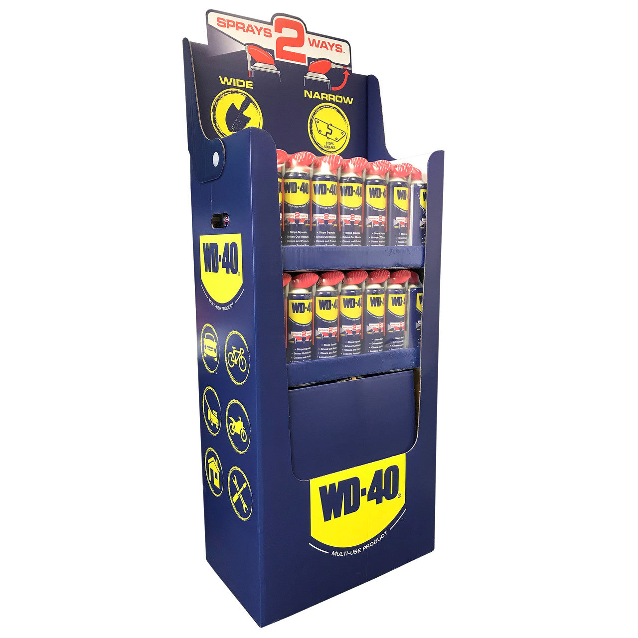 A pack of 56 x 450ml cans of WD40 in a cardboard box which can double as a display case. WD-40 Multi-Use Product lubricates moving parts such as hinges, wheels, rollers, chains, and gears. It protects against rust and corrosion on items like tools, and sporting equipment. It penetrates to free stuck corroded parts like nuts, bolts, valves and locks. It quickly removes adhesives, corrosion and paint. It displaces moisture to restore water flooded equipment such as engines, spark plugs and power tools.