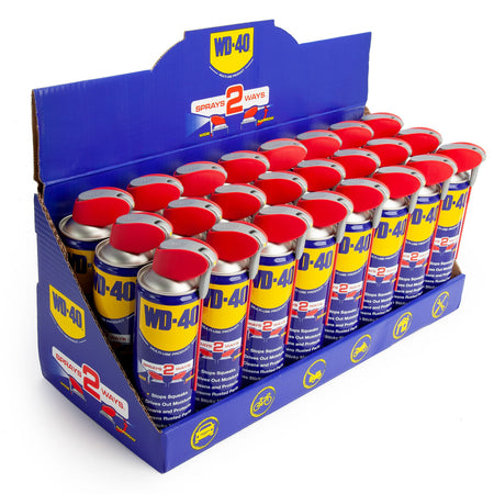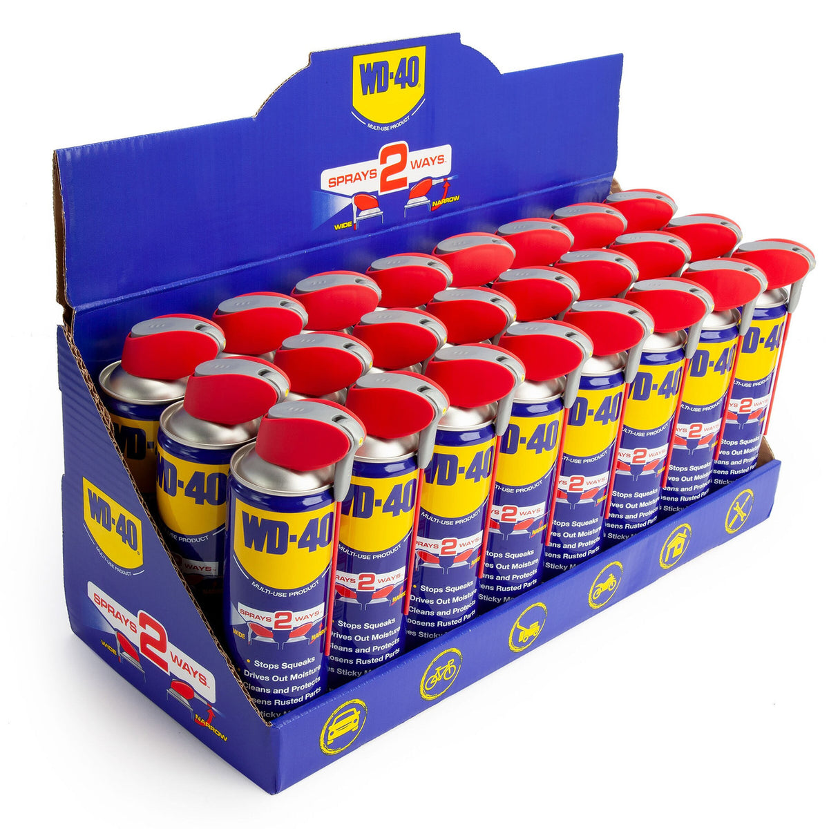A pack of 24 x 450ml cans of WD40 in a cardboard box which can double as a counter display. WD-40 Multi-Use Product lubricates moving parts such as hinges, wheels, rollers, chains, and gears. It protects against rust and corrosion on items like tools, and sporting equipment. It penetrates to free stuck corroded parts like nuts, bolts, valves and locks. It quickly removes adhesives, corrosion and paint. It displaces moisture to restore water flooded equipment such as engines, spark plugs and power tools.