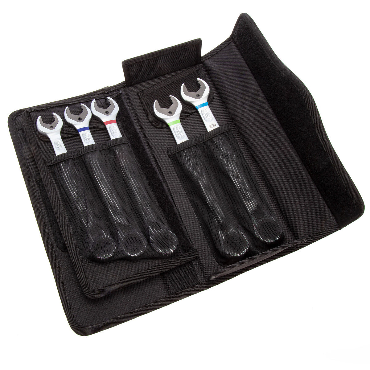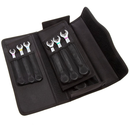 The Wera 6001 is an 11-piece high-quality set of ratchet spanners with angled ratchet heads and switch levers. A metal plate in the jaw enables a holding function reducing the risk of losing nuts and bolts. A limit stop prevents slipping meaning you can apply more torque. A low return ange of 30 degrees speeds up fastening and a reverse ratchet at the ring end gives flexibility when space is at a premium. Chrome-molybdenum steel with a nickel-chromium coating gives protection against corrosion.