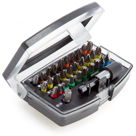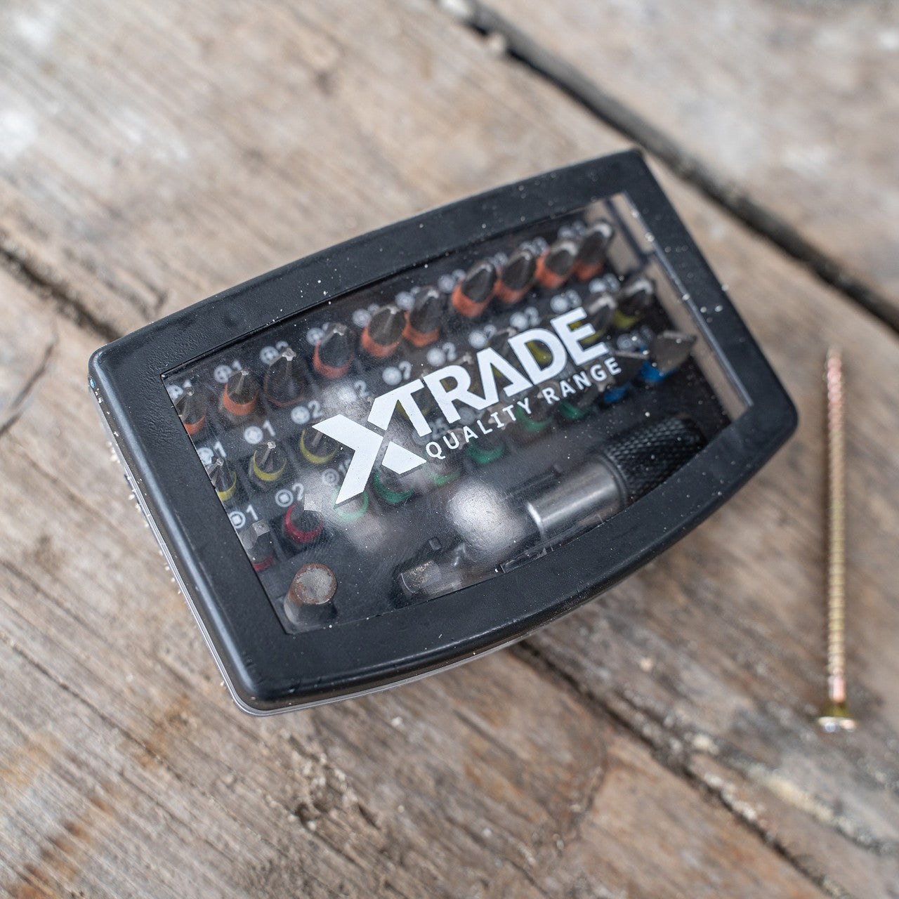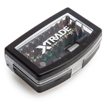 The XTrade Screwdriver Bit Set has 30 colour coded bits for easy selection, in all the popular sizes. The set is S2 Trade Quality for durabilty, S2 alloy steel is a shock-resisting tool steel type. Also includes a square bit adapter, magnetic bit holder and a storage case with flip top and belt clip.