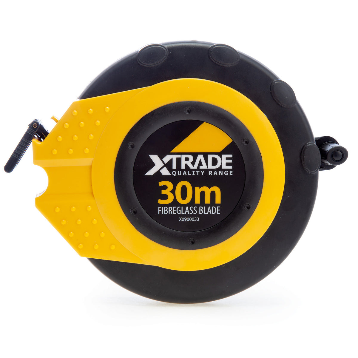 The XTrade X0900033 is a Tape Measure with clearly marked scales up to 100 feet or 30 metres. The casing is fully enclosed which helps to keep the tape clean and enables neat storage every time it is rewound. The case is fitted with a fold-away handle that has a 3:1 gearing for a much faster return.