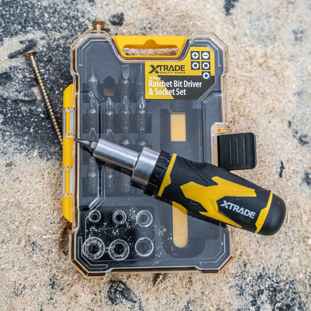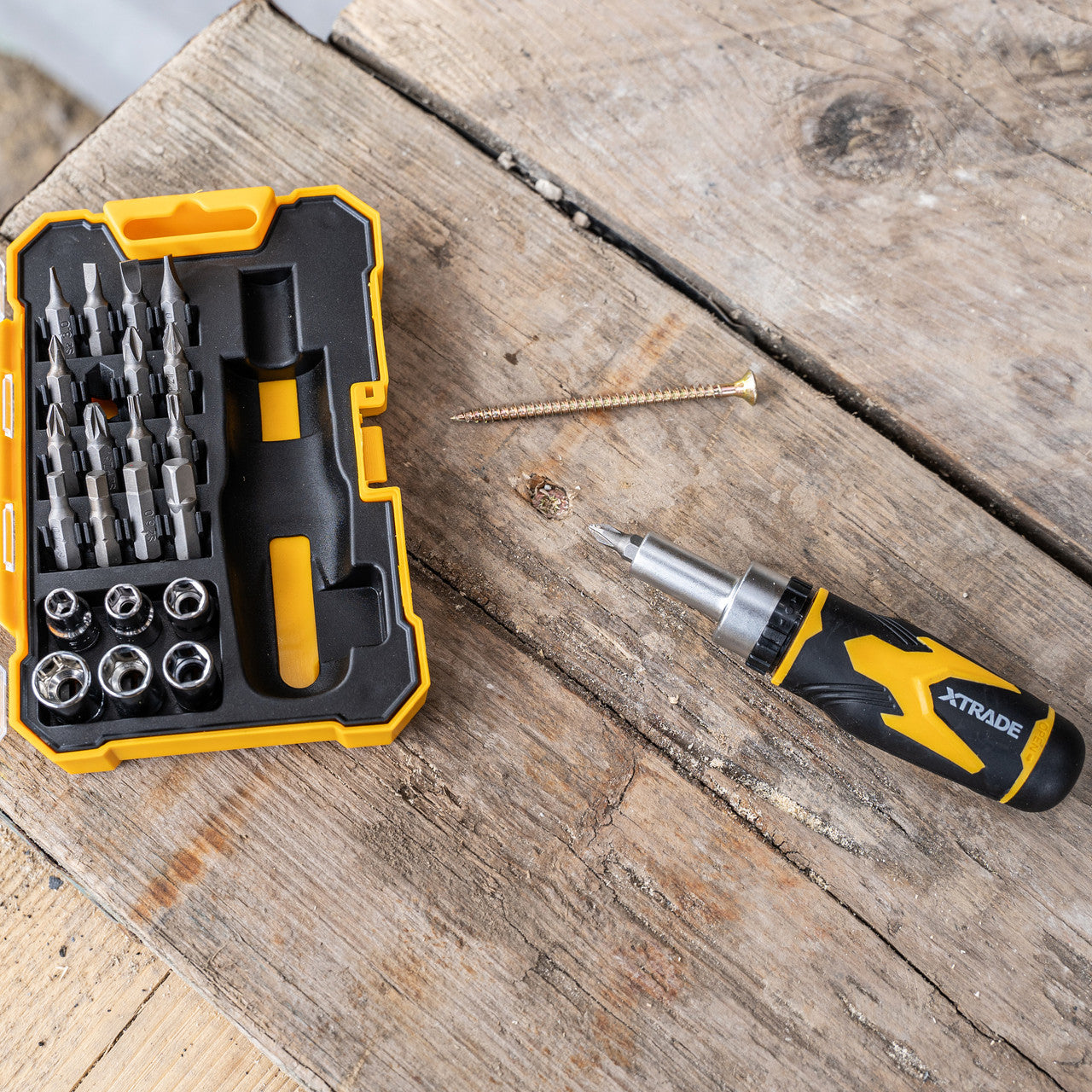 The XTrade X0900076 Ratchet Bit Driver & Socket Set is a space-saving and efficient solution for tackling various fastening tasks. This 23-piece set combines the functionality of a ratchet screwdriver, screwdriver bits, and sockets, allowing you to drive a wide range of fasteners with just one comfortable handle.