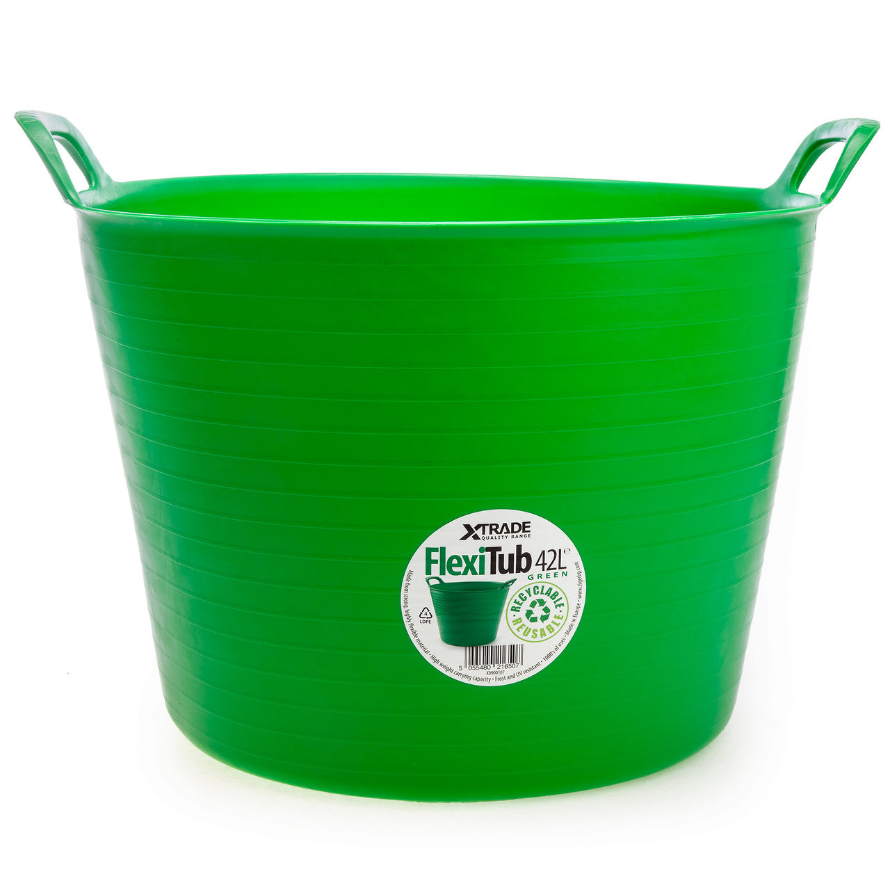 The XTrade X0900107 is a 42 Litre capacity, Green Flexible Tub with an almost endless amount of uses. Because of their shape, they stack inside each other for neat storage. Moulded in one piece with 2 strong carry handles. The Tub is environmentally friendly, made from 100% Recyclable and Reusable Virgin Plastic, with no harm to nature. Could be used in the building trade, for gardening, or domestically as a washing basket. The list goes on and on.